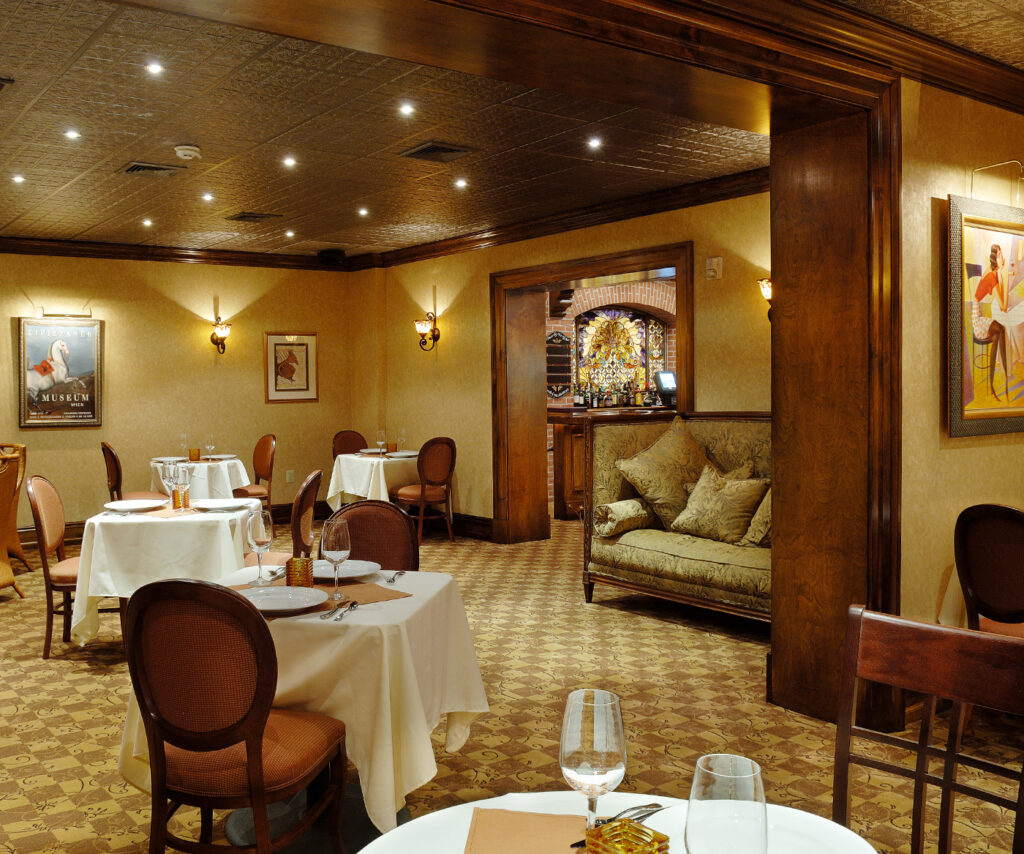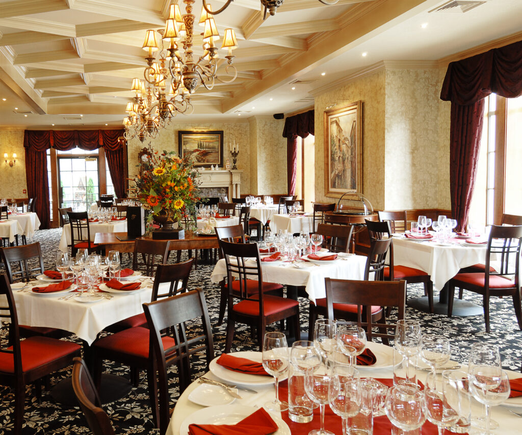 Fine dining on the upper level of the hotel with Venetian plaster walls, plush drapery, and brilliant chandeliers. Stefano’s overlooks Skippack Creek and has beautiful views of the village. A great room for large parties, weddings, or corporate functions.